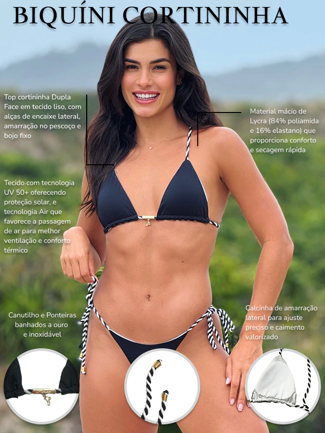 O Biquíni Gabi é o modelo perfeito para as mulheres que buscam conforto e praticidade na hora de se vestir para a praia. Com o top cortininha com bojo fixo e alças com elástico, é possível criar diversas amarrações, deixando a peça ainda mais versátil e estilosa. O charme do modelo fica por conta das alças em preto e branco, que dão um toque diferenciado e moderno à peça.