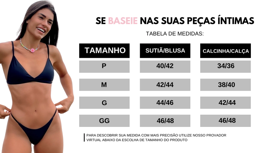 O top possui bojo removível e alças de encaixe, permitindo amarração lateral ou no pescoço, com costura em viés na lateral que ajuda a juntar e sustentar os seios.