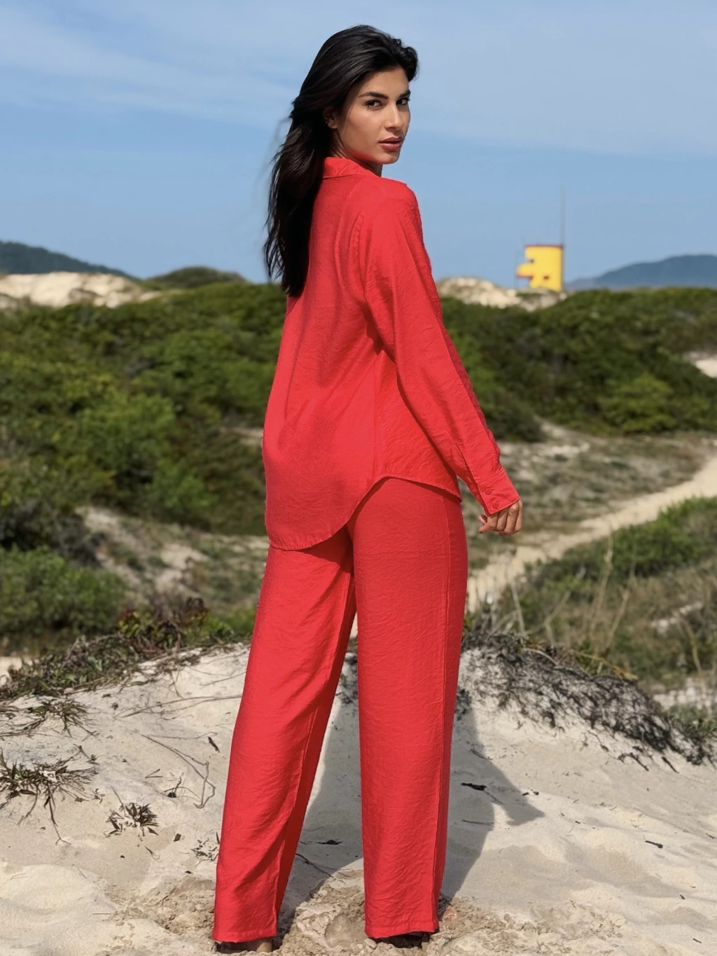 O Conjunto Thalia é a escolha perfeita para quem ama praticidade com estilo. Ele vem com duas peças versáteis e elegantes: uma camisa de manga longa com botões frontais, gola clássica e botão nos punhos para um ajuste impecável, e uma calça com elástico na cintura e cordinhas para regular do jeitinho que você gosta. Ideal para ir da praia a um jantar à beira-mar, esse conjunto transita facilmente entre o casual e o sofisticado, sem esforço.